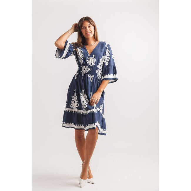 Papillon 1/2 Sleeve Boho Printed V-Neck Dress With Pockets In Navy