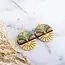 The perfect accessory for any occasion, these statement-making beauties will be your go-to earrings. Featuring an Art Deco fan pattern in shades of green and metallic gold, and accented with a brass sunburst, these gorgeous earrings can take you anywhere in style. Handcrafted from sustainably harvested hardwood, handprinted European paper, glossy, vegetable-based resin, and handcrafted gold-filled ear wires.