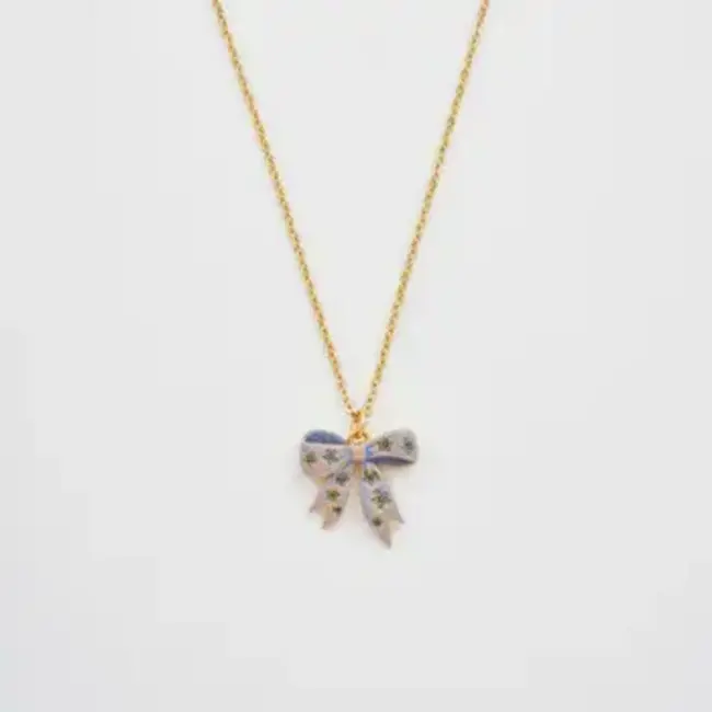Embrace a playful touch to your jewellery collection with the Gold Forget Me Not Bow Pendant Necklace. Hand-painted in soft blues and greens, the delicate bow pendant rests on a 22ct worn gold-plated brass chain, with engraved flowers for the signature Forget-Me-Not flourish. Feminine and nostalgic, this piece is perfect for layering or wearing alone as a little treasure to brighten your day.