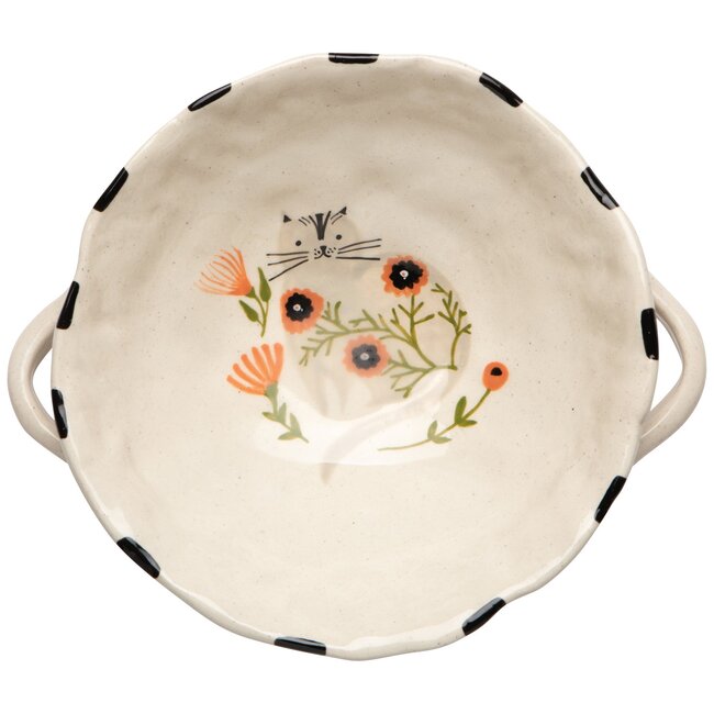 Elevate everyday rituals with our footed Catbloom bowl, where a captivating creature guards precious keepsakes and daily essentials. An undulating surface, organically shaped edges, and a glossy finish provide a textural and handmade appeal. Made from 25% recycled stoneware. Catbloom offers a cat's eye perspective of these sly stewards of gardens.