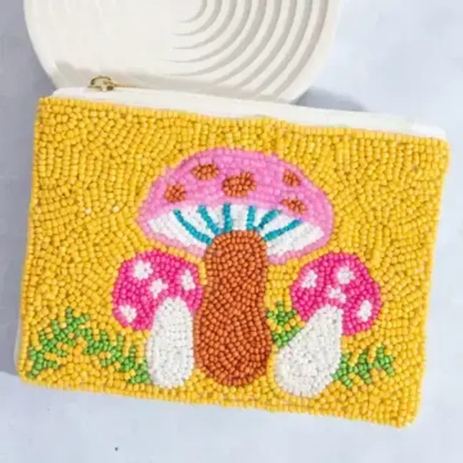This coin purse displays a fashionable vibrant mushrooms seed beaded style. Embark on a journey of sartorial refinement as this coin purse effortlessly complements your fashion sense.