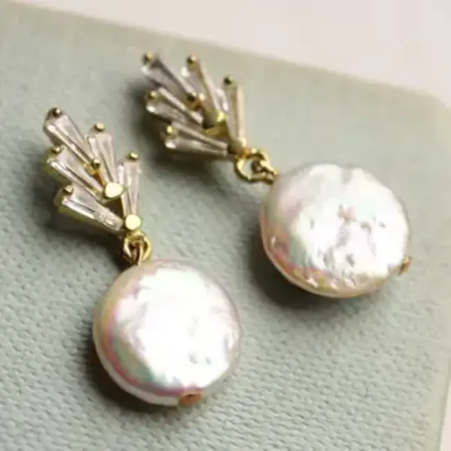 These beautifully detailed art deco earrings feature a stylised crystal geometric design with a single freshwater pearl. The freshwater pearl has a very subtle lilac iridescent colour, which takes on an amazing, beautiful sheen in certain lights. This iridescence with the organic, uneven texture of the pearl looks great with the strong, classic art deco design of the gold brass.