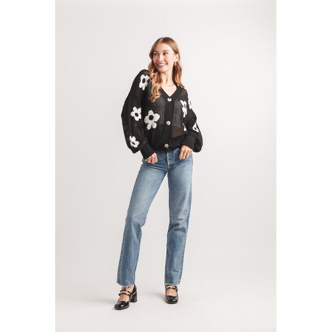 Crafted from soft, breathable open-knit fabric, it features a delicate daisy pattern that adds a playful, summery touch to any outfit. The relaxed, open-front design ensures comfort and versatility, making it ideal for pairing with tanks, tees, or dresses. Lightweight and easy to style, this cardigan brings effortless charm to casual and polished looks alike.