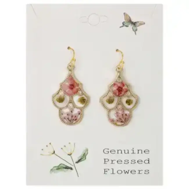 A little nature, a little glam! These gold chandelier earrings feature real dried flowers encased in acrylic with gold frames, capturing a moment of botanical beauty.