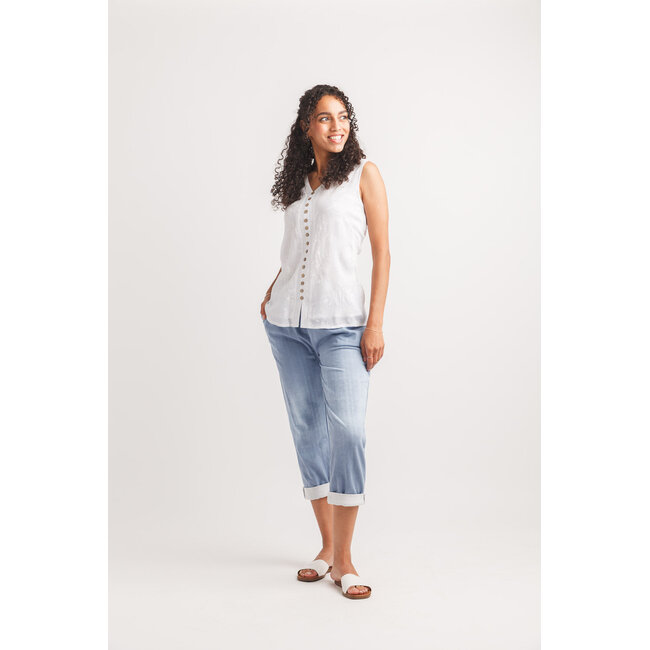 Featuring a unique embossed crinkle design, this sleeveless blouse adds subtle depth and movement to your look. The button detail along the front enhances the blouse’s classic appeal, making it perfect for both casual and dressier occasions.