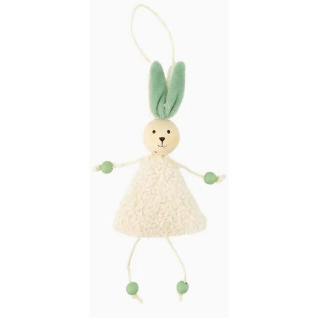 Fabric bunny ornaments, pale yellow and green with wood bead trim.