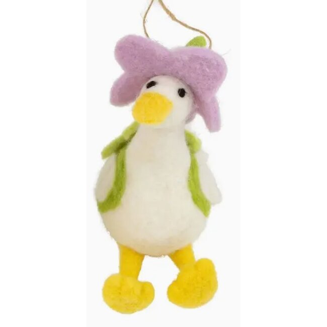 Felt duck ornaments with green vests and lavender hats.
