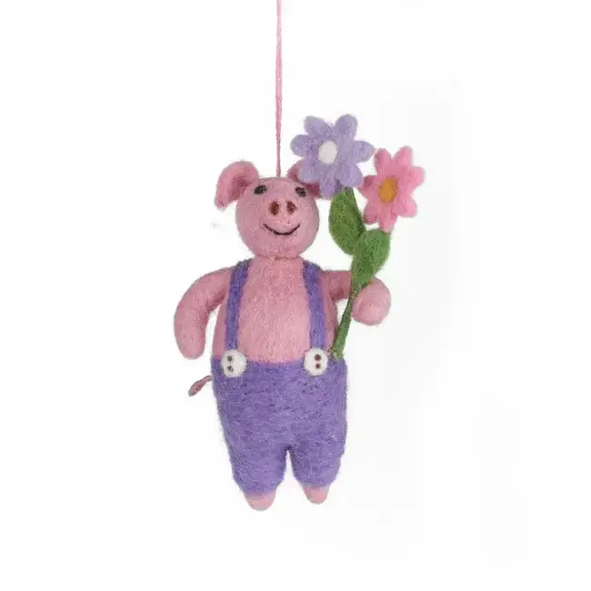 This little piglet has brought flowers from the market just for you! He has squeezed his round pot belly into his favourite purple dungarees done up with felt buttons. Each flower has been hand cut from wet felt and sewn to the stem. He is made from 100% wool making his belly full of felt with no plastic involved. His happy little face has been needle felted into place by our team of amazingly skilled traditional Artisans in Nepal. Nothing but love and happiness for this little piggy!