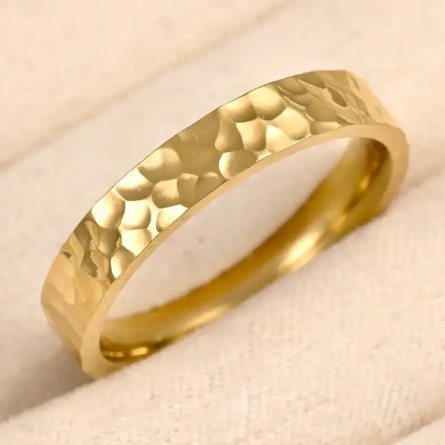 This stackable ring is made from stainless steel with an 18k gold PVD plating, providing a tarnish-resistant, waterproof finish. The design features a bold, hammered texture band for a handcrafted look. Measuring 4mm in width and 2mm in thickness, it is perfect for stacking with other rings.