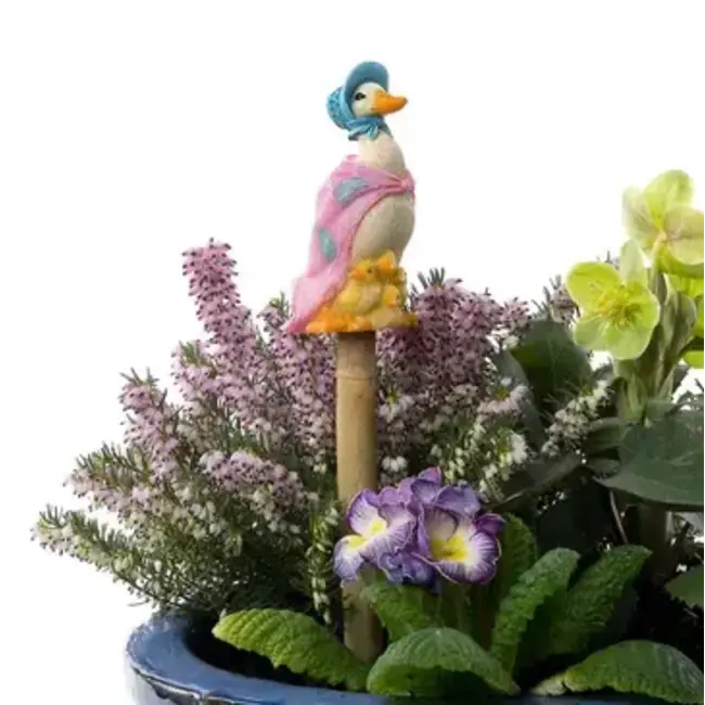 Our award-winning Colour Jemima Puddle-DuckCane Companion has been custom designed and manufactured by Jardinopia Ltd, and is made from a durable poly resin and crushed stone based material. It is frost proof, UV resistant and hand-painted using lead-free products – meaning you can leave it outside all year around and the paintwork will not fade or flake in extreme temperatures and the product will not be adversely affected by frost.Colour Jemima Puddle-Duck Cane Companion is an ideal gift for garden and animal lovers alike. Each Cane Companion is beautifully gift packaged using 100% recycled (and onward recyclable) craft card materials.