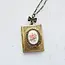 This is a vintage style antique brass book locket necklace. The locket pendant has lovely etched designs and on the face of the locket is a framed pink rose on white glass cameo.