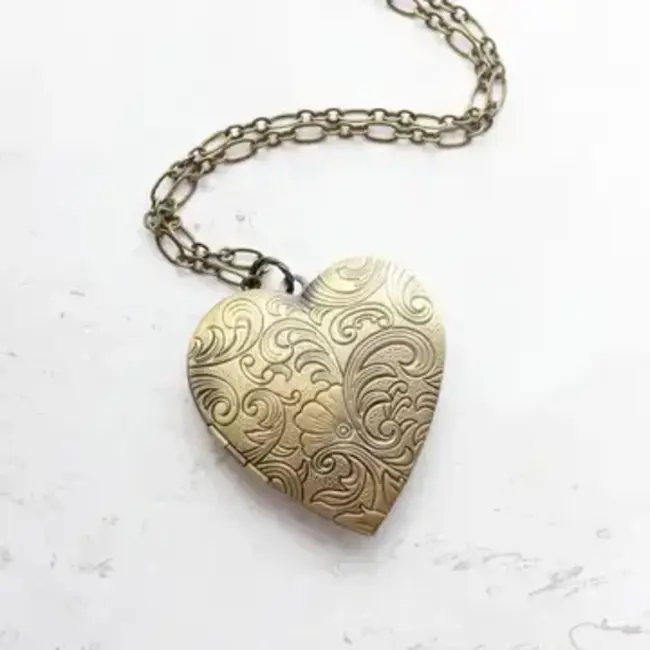 This is a large antique gold brass heart locket necklace with a swirling floral etched designs!