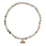 - Materials: 4mm semi-precious faceted stone beads, brass logo charm, stretch cord.
