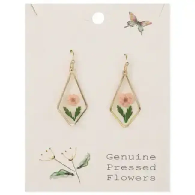 Blossom in vintage style with these gold diamond shaped earrings, filled with delicate light pink and white dried flowers.