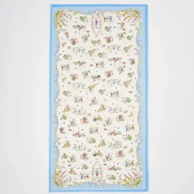 Add elegance and storybook charm to your looks with the Fable England x Peter Rabbit Cream Rectangle Scarf. Crafted in a soft, lightweight fabric, this refined accessory features delicate Peter Rabbit illustrations set against a classic cream background, finished with light blue trims. Perfect for the end of winter and into spring, it can be styled around the neck or draped over the shoulder for a subtle nod to nostalgic storytelling.