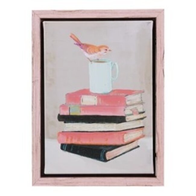 Wood Framed Canvas Wall Decor with Bird, Mugs & Books